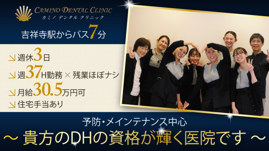 <吉祥寺駅からバス7分>週休3日×週37H勤務×残業ほぼナシ★月給30.5万円以上可・東京一人暮らしを応援★優しい院長!予防・メインテナンス中心でDHの資格を活かして活躍できる医院です♪