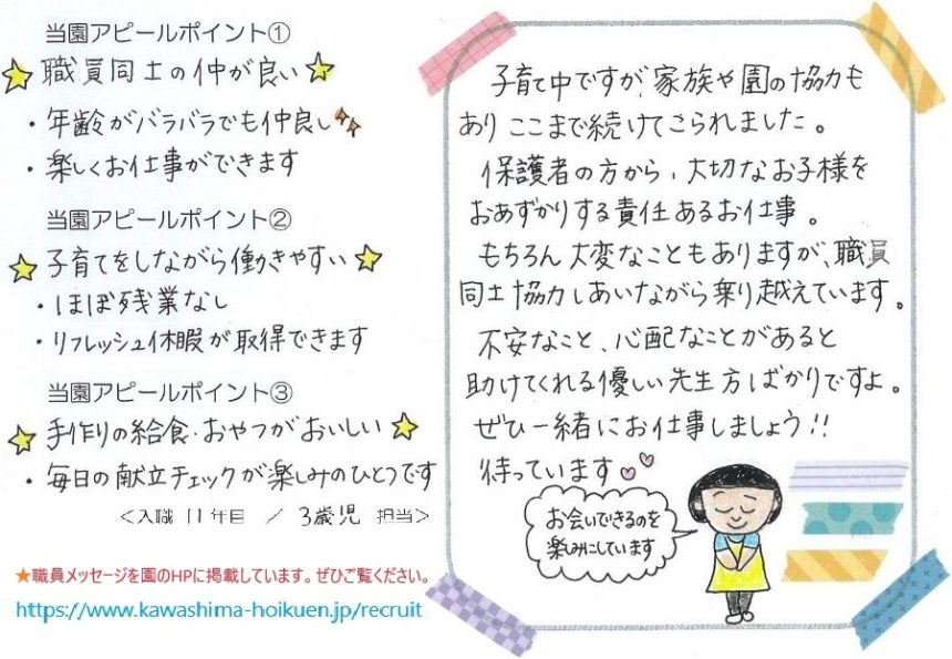 | 応募方法 | ご応募の際は下記ホームページよりご応募ください。 ホームページから応募する:https://www.kawashima-hoikuen.jp/recruit お電話でお問い合わせの場合は下記番号に「ジョブエンジンを見た」と言って頂けるとスムーズにお繋ぎすることができます。 0296-28-0419 ↓ 書類選考・面接 ↓ 内定 ※応募に関するお問い合わせ等、お気軽にどうぞ。 ※入社日などのご相談にも応じます。 |